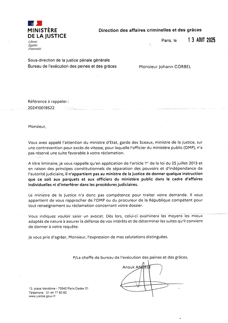 Suite à la réponse reçue il y a 2 semaines concernant la contestation de mon excès de vitesse du 4 juin 2023, j’ai décidé de signaler le comportement illégal de l’OMP de la Celle St Cloud au garde des sceaux !